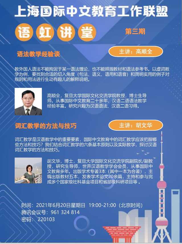 2021年6月20日晚19点,上海国际中文教育工作联盟“语虹讲堂”第三期开讲。