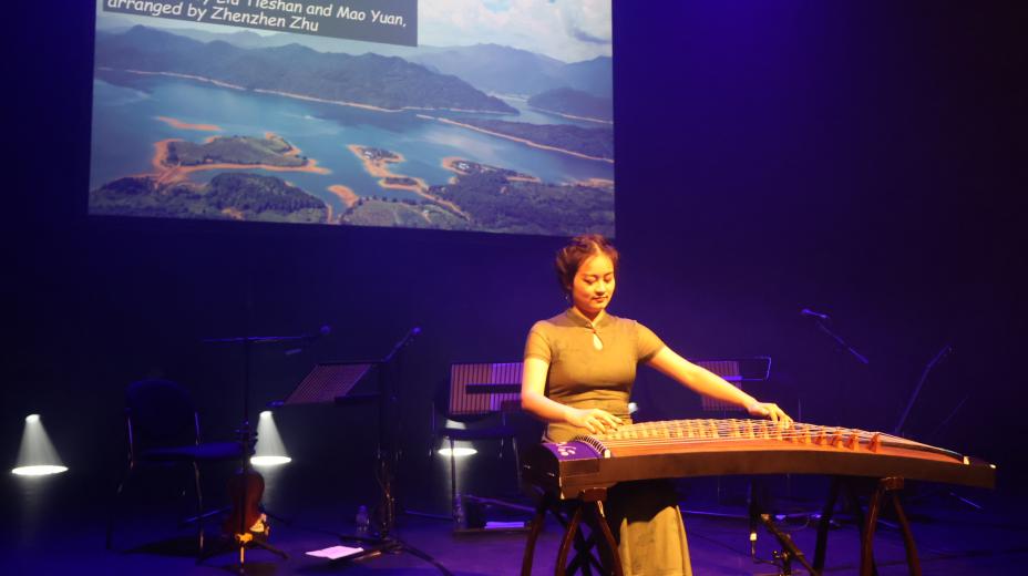 随后,演奏家朱贞真以古筝独奏《瑶族舞曲》,欢快的节奏如同瑶族人民踏歌起舞,民族音乐魅力生动呈现。中场互动环节,她还演奏了西方经典流行曲目《Here is a pirate》和《Believer》,请观众踊跃参与猜歌,中国传统乐器与现代旋律的碰撞使现场气氛推向高潮。
