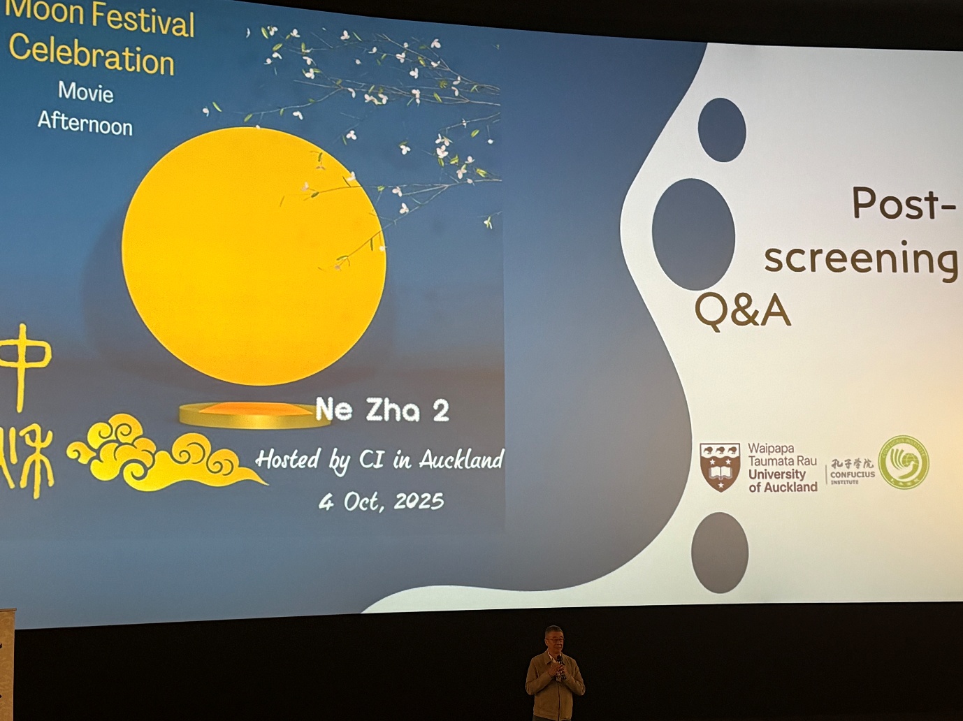 电影放映结束后,活动进入互动分享环节。奥克兰孔子学院新方院长周学麟教授登台,结合影片内涵进行解读,他指出:“《哪吒》系列作品中蕴含的中华传统价值观,与中秋节‘团圆和睦’的寓意一脉相承,都是中华文化的重要精神内核。” 这番分享引发强烈共鸣。随后,观众们纷纷举手发言,表达观影感受,提出问题,周学麟教授逐一细致解答,现场交流气氛热烈而融洽。孔子学院也为互动观众准备了富有中国特色的礼包,与大家一起以电影传情,共庆中秋佳节。