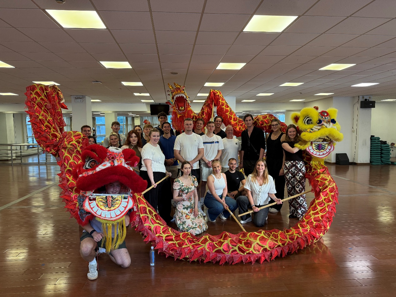 行程尾声,一场热闹非凡的舞龙舞狮文化体验活动为此次访问画上圆满句号。学生们分组体验了九人龙、五人龙、舞狮等项目,从一开始的略显生疏,到逐渐掌握节奏与技巧,在欢声笑语中感受中国传统民俗文化的活力与魅力。经过短短一节课的学习与练习,学生们还共同呈现了一场精彩的舞龙舞狮汇报表演,灵动的龙身、憨态可掬的狮子在学生们的操控下栩栩如生。