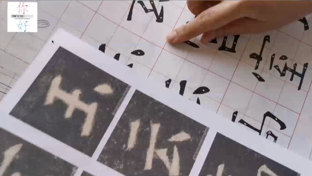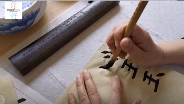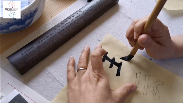 卢森堡大学孔子学院书法课程视频截图:书法老师示意临摹步骤