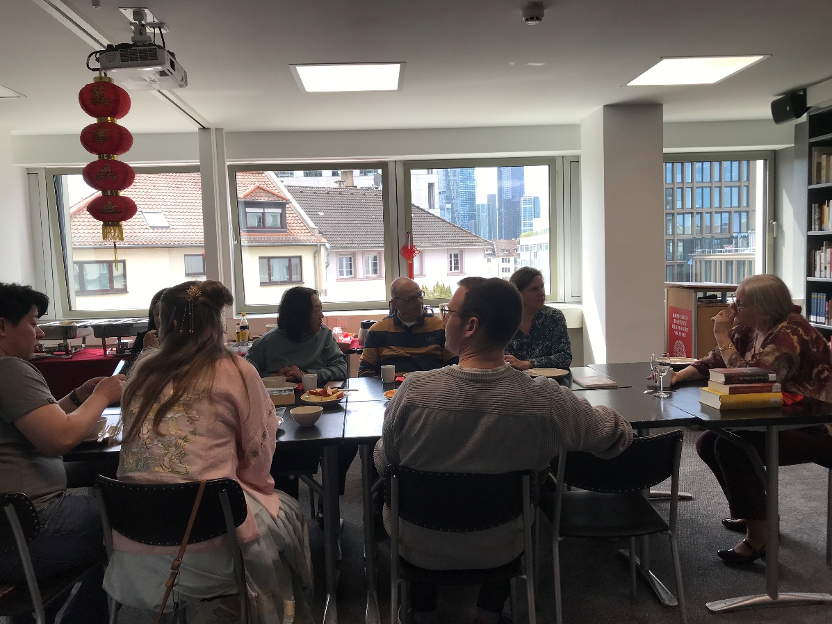 当地时间4月25日,法兰克福孔子学院举办中文与中国文学主题活动,以庆祝第十七个“国际中文日”及第三十一个“世界读书日”。当天的主题活动共分三个项目:中国文学交流会、汉字学习与体验以及摄影比赛颁奖仪式。活动旨在通过现场交流与体验,让当地中国语言文学爱好者在阅读中国文学译作的同时了解汉字结构与汉字书写方式,并激发对中国传统文化艺术的兴趣。在上午进行的中国文学交流会上,参与者多数为孔院线上读书俱乐部的学员,按照规定他们每人携带一本自己阅读过的有关中国的书籍,并向在场的所有人用5分钟时间介绍书本内容和精彩片段。为了活跃气氛,孔院还为参与者提供了简单的中式早餐,与会者一边享用中国特色早餐,一边交流各自阅读德译版中国文学作品的心得体会,分享阅读乐趣。他们也提出了各自在阅读中遇到的一些疑问和作品中的社会历史背景等,对此孔院教师们一一给予解答。交流会结束后,读者们纷纷从孔院图书馆的书架上选取自己喜欢的图书,登记后带回了家,为下一场读书俱乐部活动做准备。在下午的中文学习体验环节里,孔院团队设计了一系列汉字学习与互动活动。其中包括猜字游戏、汉字书写、挑战“记忆配对”游戏、汉语趣味绕口令,以及亲手制作传统中