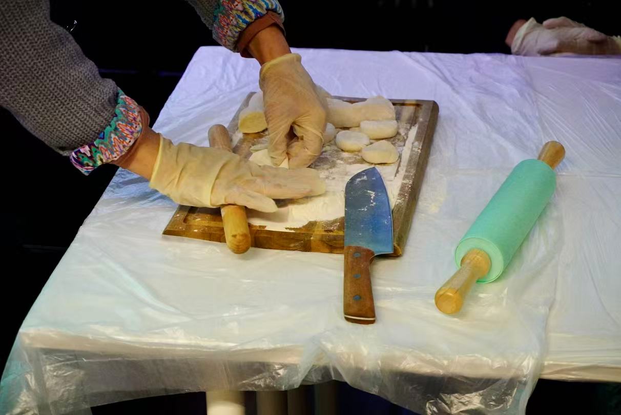 活动在喜庆的春节音乐中开始。孔院老师将提前和好的面团稍作揉制,切成一个个均匀的小面块。随后,她演示了擀饺子皮的方法:手掌轻压、擀面杖均匀推送,一张张圆润的饺子皮便很快成形。