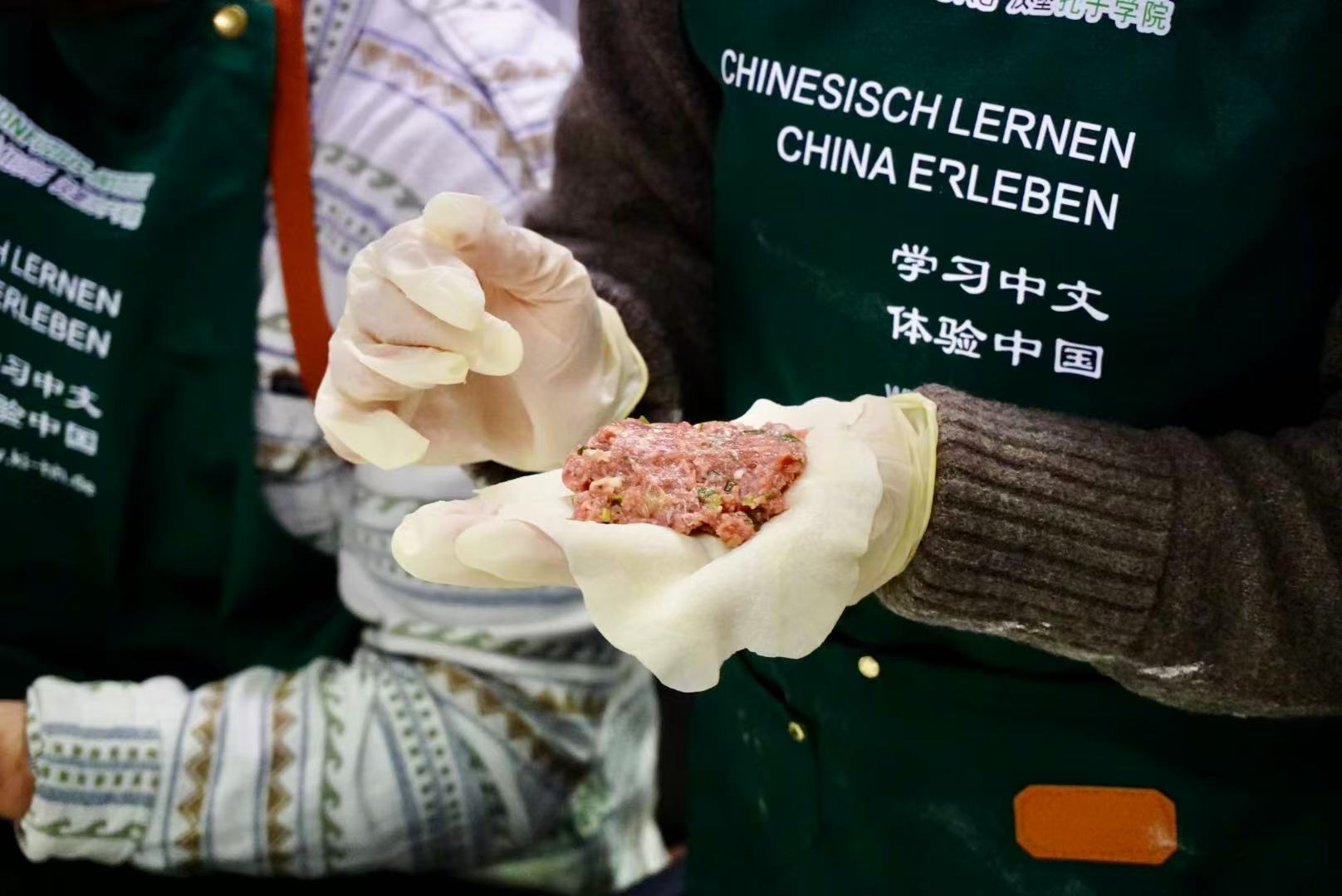 接着,老师端出两种饺子馅——牛肉大葱鲜香浓郁、西葫芦鸡蛋蘑菇清新爽口。考虑到不同参与者的饮食习惯,孔院特意准备了肉馅和素馅两种选择,让素食朋友也能一同体验中华美食。从填馅、捏合到收口,老师一步步示范,大家认真跟学。虽然包出的饺子形态各异,但每个人都包得很投入。现场笑声不断,气氛轻松又热闹。