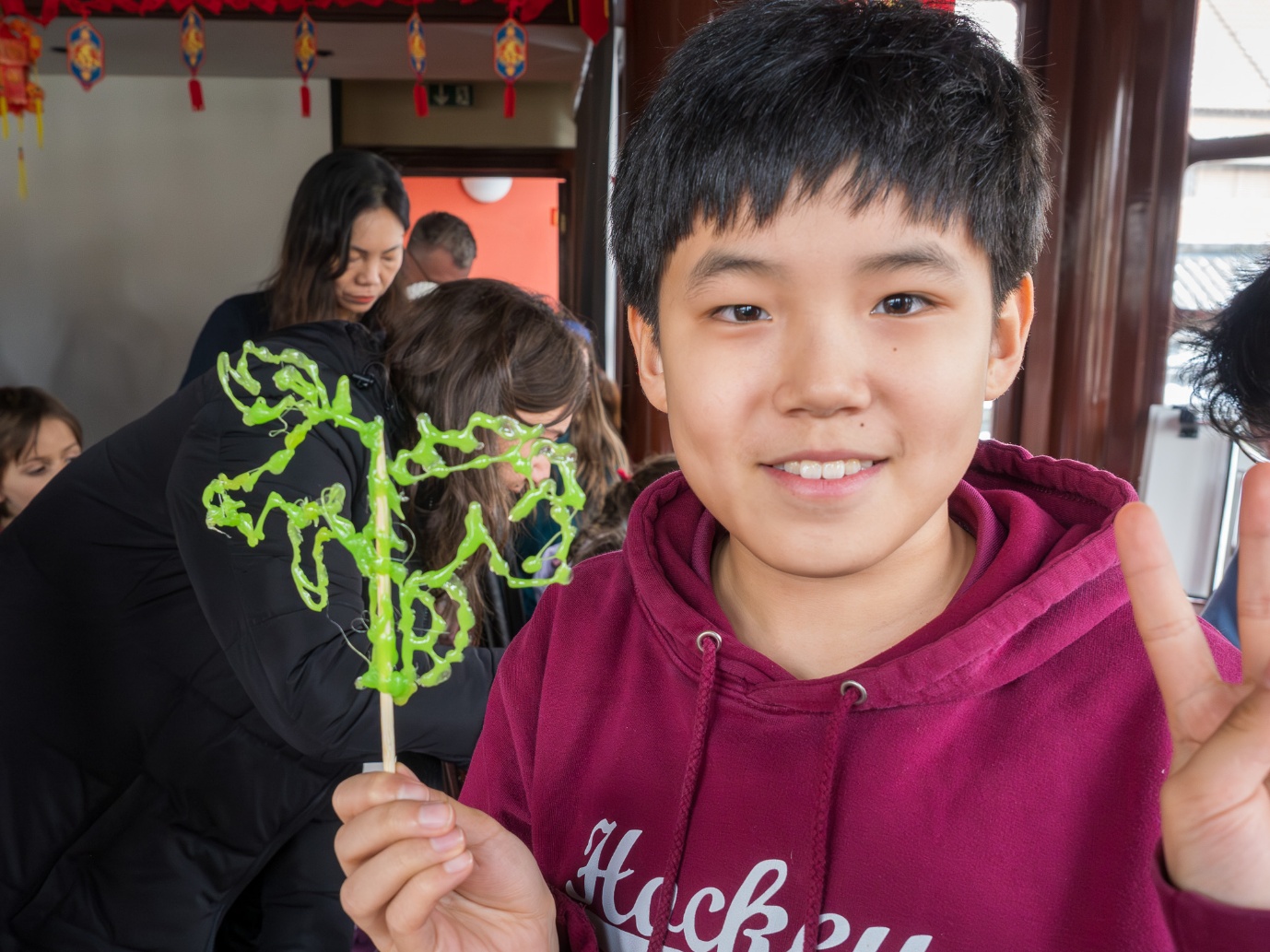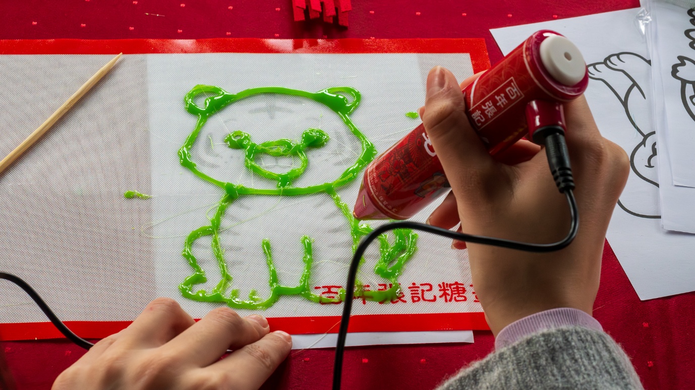 糖画摊位香甜四溢,成为孩子们最喜爱的角落。他们以融化的糖浆为“画笔”,在画板上勾勒出栩栩如生的十二生肖图案。在创作过程中,孩子们的个性展现了出来:有的落笔果断、一气呵成;有的则屏息凝神,细细勾勒。虽然很多孩子都是第一次接触糖画,收尾时免不了要修修改改,但最终大家都顺利完成了自己的作品。当金灿灿的糖画凝结成型,孩子们不仅收获了亲手制作的快乐,也近距离感受到了中国传统民间艺术的趣味。