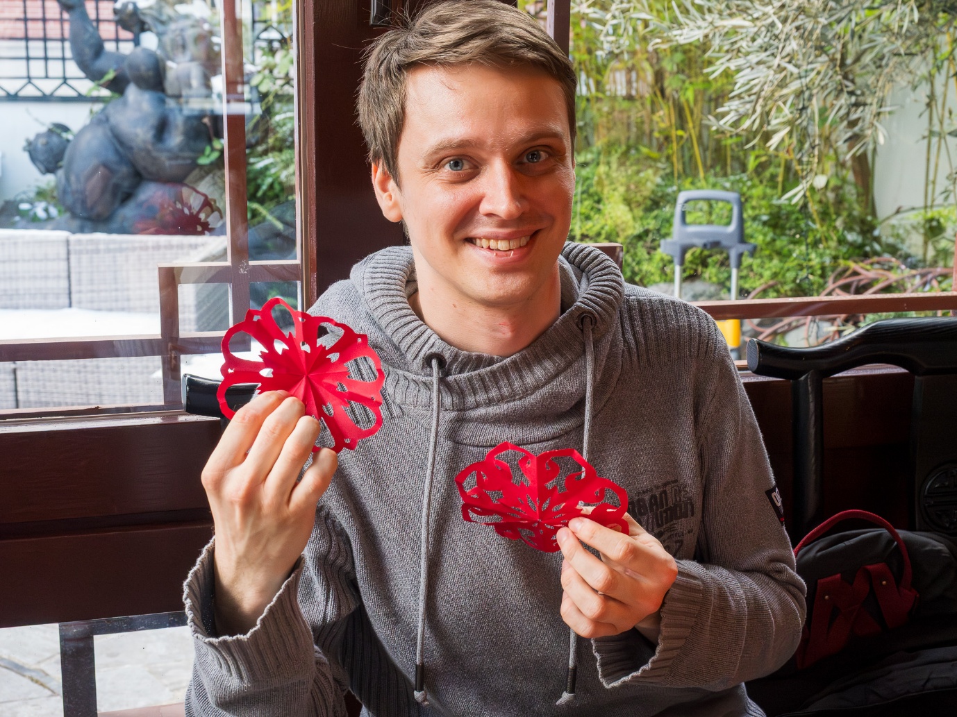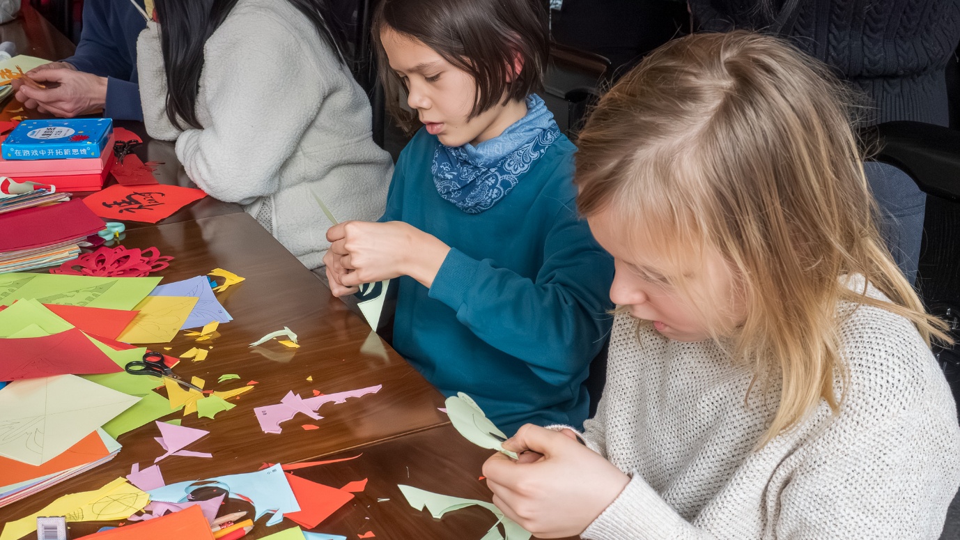 孔院老师现场示范折纸、绘图与剪裁技巧,一张张红纸在剪刀翻飞中变换成一个个生动的图案——有生肖马、春字纹、喜庆窗花等。大家聚精会神地剪着彩纸,随着作品渐渐成型,不禁眼含笑意、嘴角上扬,心里是满满的成就感。完成后,许多人小心翼翼地装好自己亲手完成的作品,带回家作为珍贵的纪念。