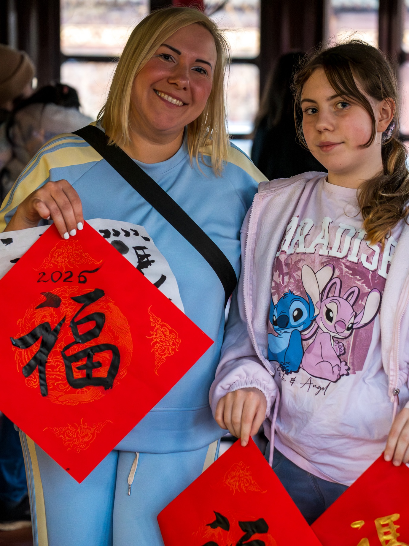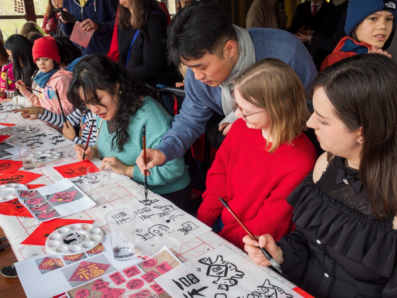 书法摊位前墨香四溢,人气爆棚。指导老师现场挥毫泼墨,教授大家运笔技巧。观众们跃跃欲试,用黑色与金色墨汁在红纸上一笔一画写下属于自己的新春“福”字。笔墨之间,汉字艺术之美尽显。写完后,大家纷纷展示并带走自己的墨宝,还表示想要继续深入学习中国书法。
