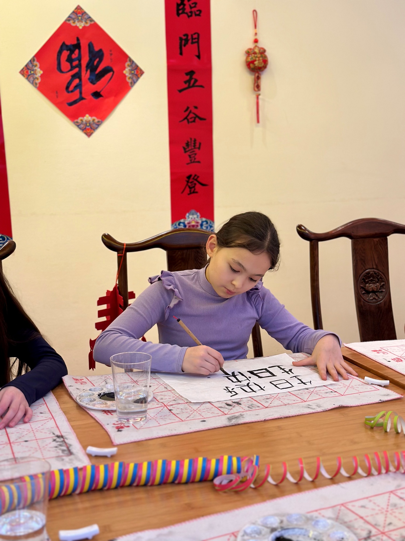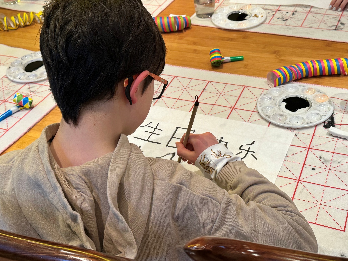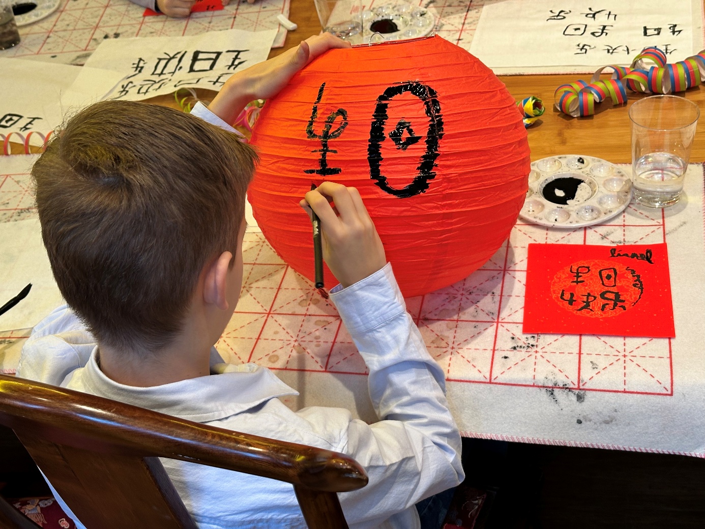 随后,孔院老师围绕“生日快乐”四个字展开讲解,细致梳理了这四个字的字形演变与由来,从古老的象形文字雏形,到如今我们常用的简化字体,每一步演变都承载着汉字的智慧与温度。讲解结束后,书法体验环节正式开启,老师手把手教孩子们握笔、运笔,耐心指导每一个笔画的写法。从练习纸上的打磨,到红宣纸上的书写,再到亲手将“生日快乐”书写在红色灯笼上,孩子们认真投入,一笔一画间,不仅感受到了书法的韵律之美,更将美好的祝福倾注于笔墨之中。