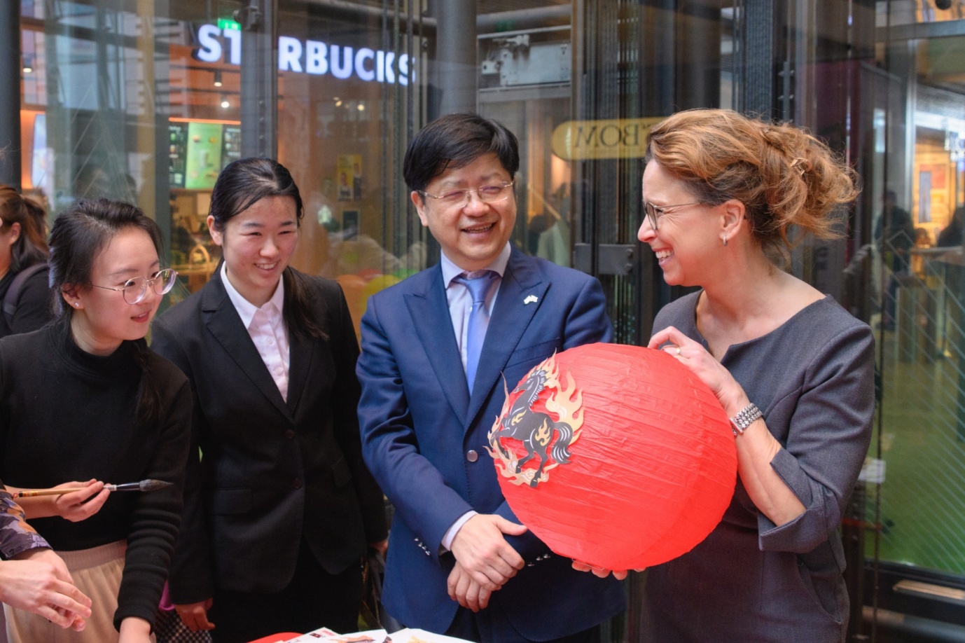 颁奖嘉宾林动总领事和费特议长随后兴致盎然地参观了文化展台。在汉堡孔子学院的展台,费特议长还亲手制作了一个灯笼。她选择了火马图案,并在孔院工作人员的指导下,在灯笼上一笔一画地写下了象征幸福的“福”字。这一刻,笔墨之间流淌的不仅是中华文化的韵味,更是中德友谊的真挚情谊。