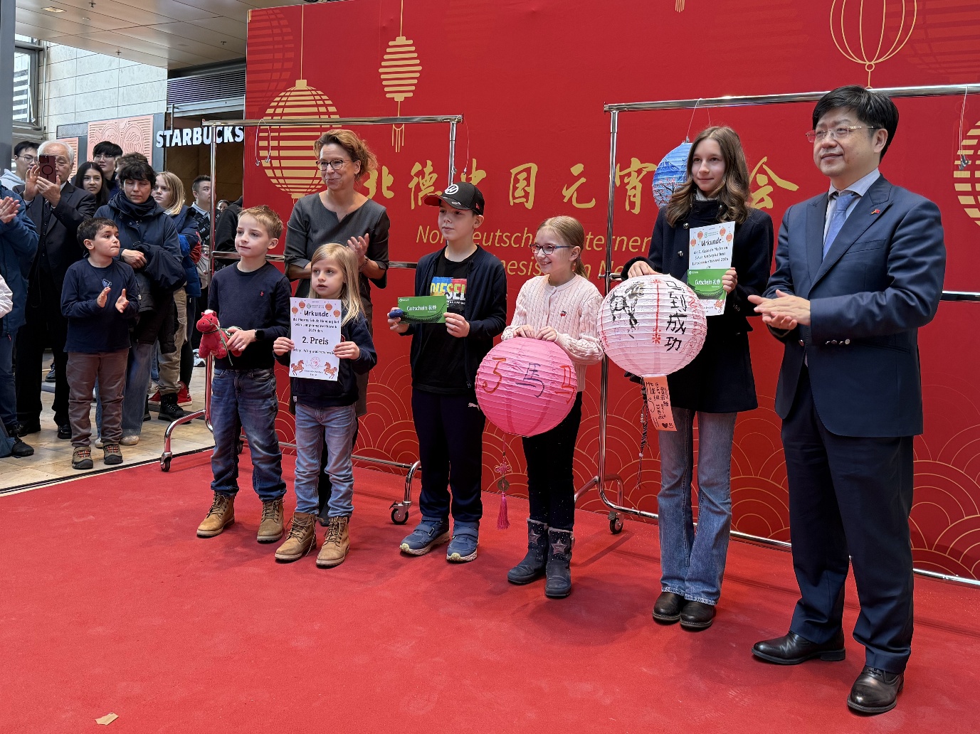 今年共有来自汉堡及周边地区中小学的二十多个班级参加了汉堡孔子学院组织的元宵花灯制作比赛。经过前期评委认真仔细的评选,共有六个班级分获一二三等。舞台上,汉堡驻中国总领馆的林动总领事和汉堡市议会议长费特女士共同为获奖学生颁发证书和奖品。学生们精心制作的元宵花灯精美别致,融入了马年元素,既有传统韵味,又有现代创意,展现了年轻一代对中华文化的热爱与理解,赢得现场热烈掌声。