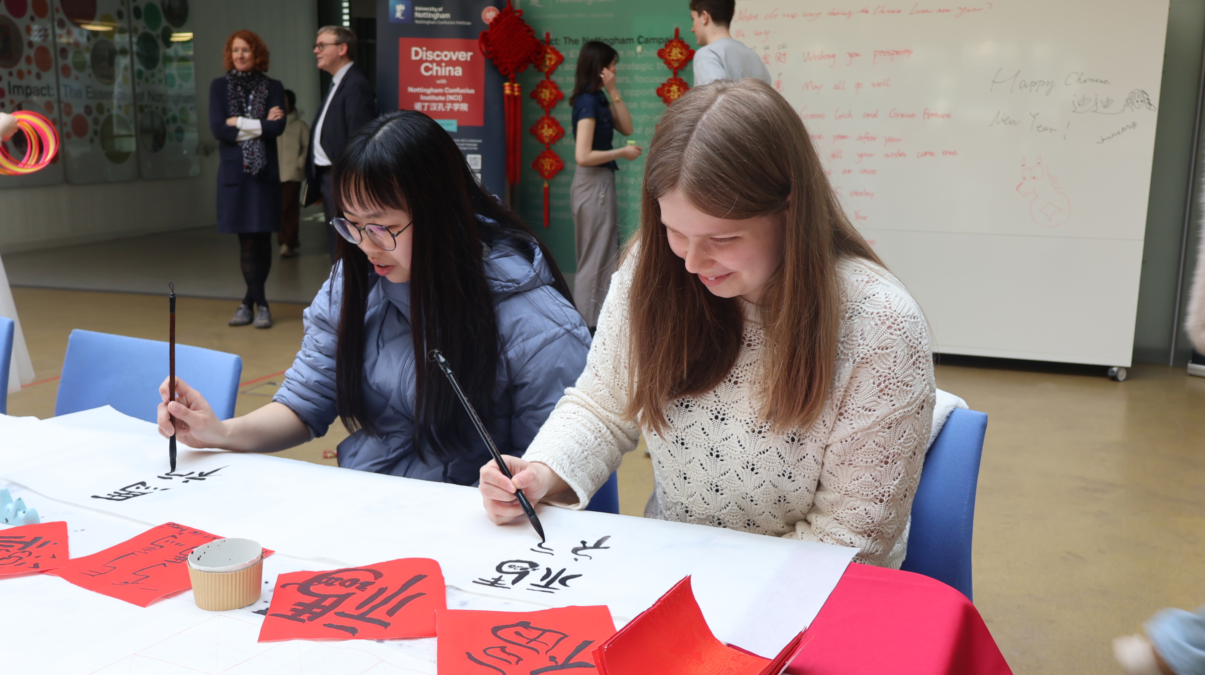 2026年2月25日,诺丁汉大学孔子学院于诺丁汉大学Faculties of Engineering and Science内,成功举办了一场别开生面的“迎新春”文化工作坊,吸引了众多在校学生与教职工的热情参与。此次活动以“庆新年”为主题,精心设置了剪纸、书法、国画及套圈四大互动体验区,并贴心准备了地道的中国传统糕点与茶水,让参与者在全方位感受中华文化独特韵味的同时,也能品味到节日的甜蜜与温馨。
