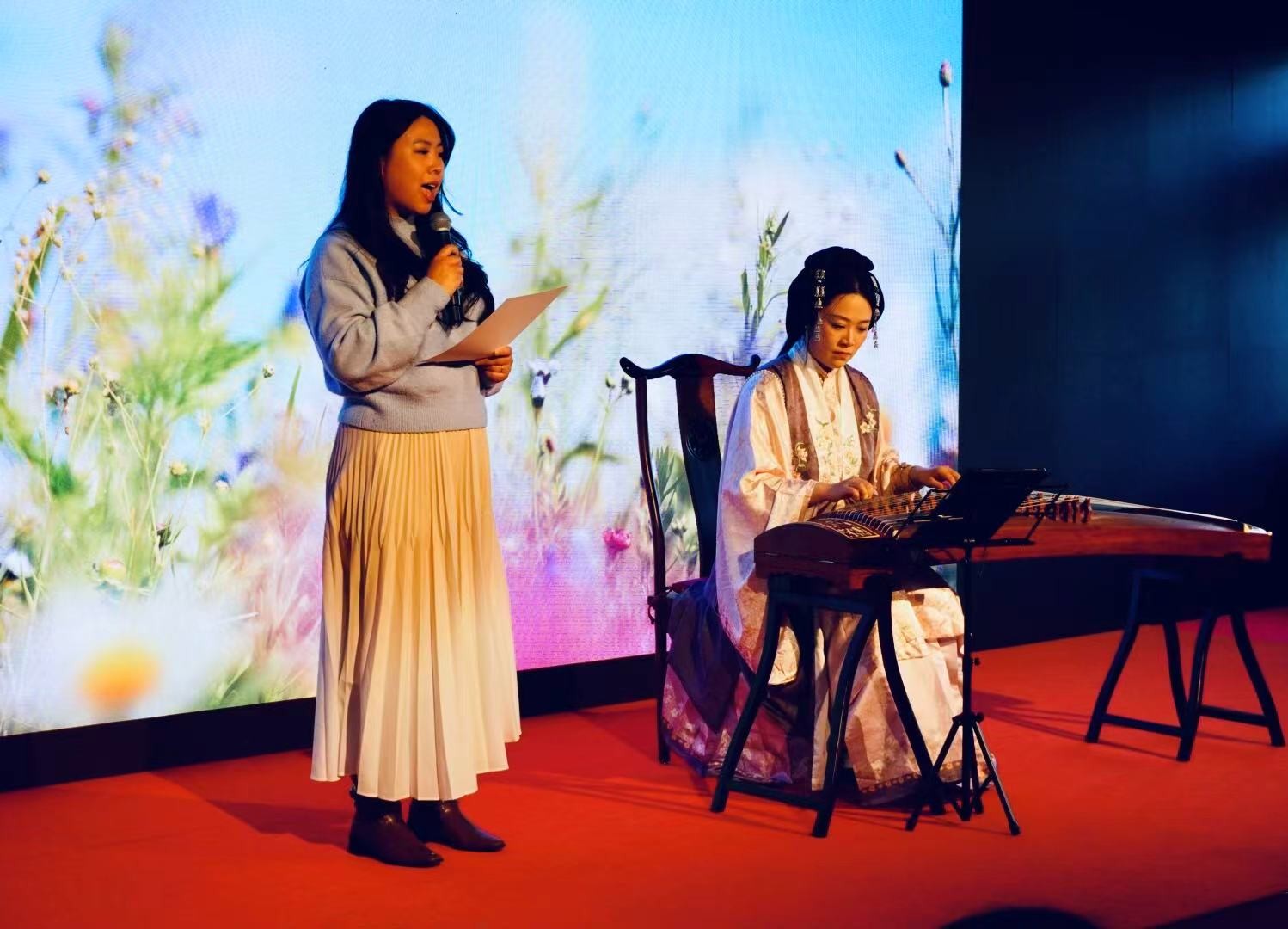 本次诗歌音乐会以“春”为主题,节目丰富多元,展现了春意盎然的自然之美与中西文化交融的艺术魅力。演出在民族乐队与合唱团带来的《春天》和《立春》中拉开帷幕,悠扬的旋律瞬间将观众带入春日的诗意氛围。