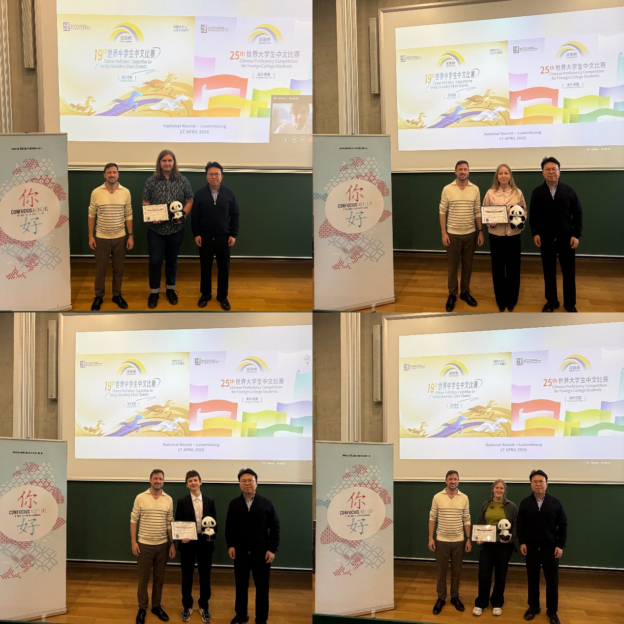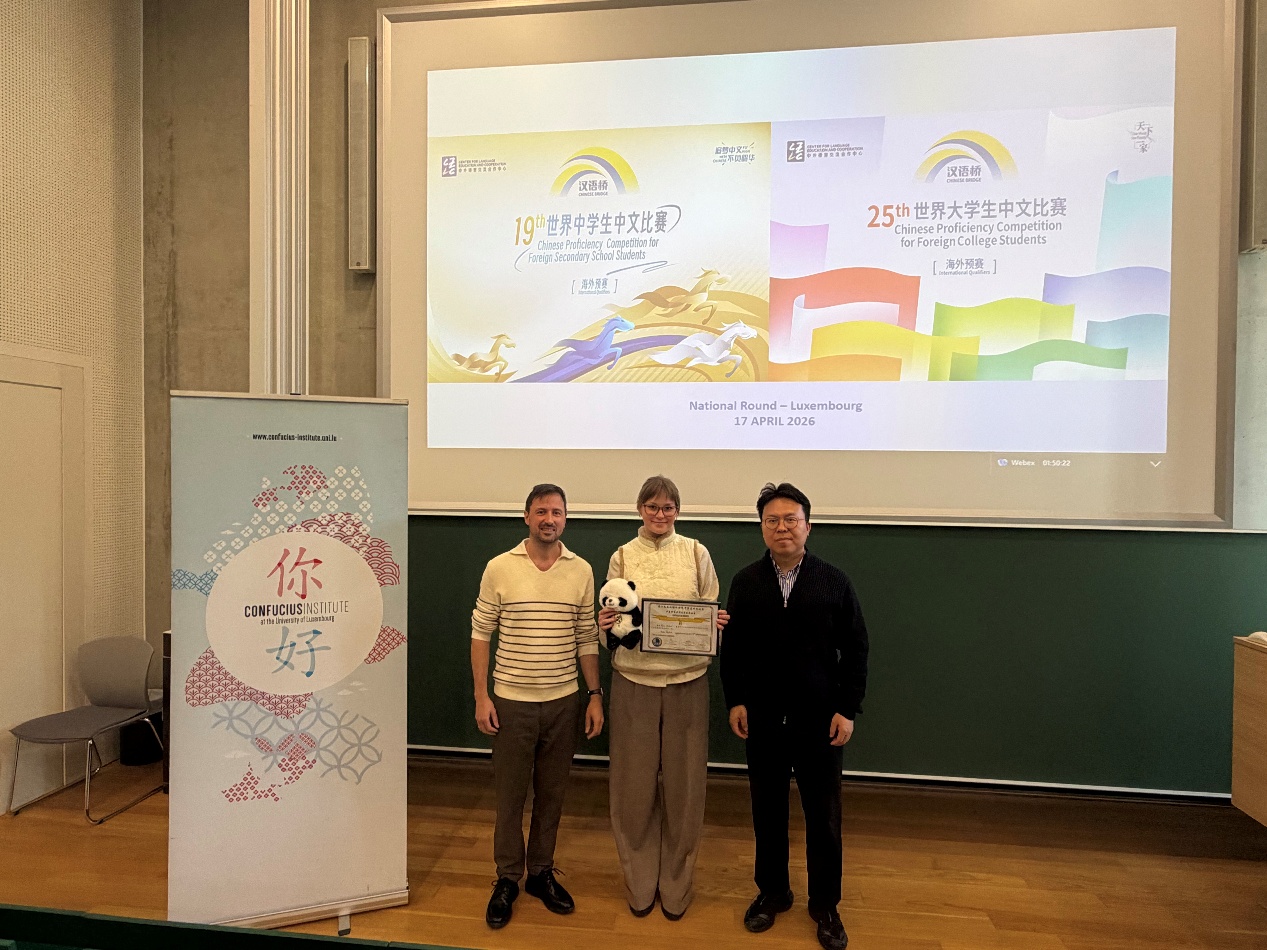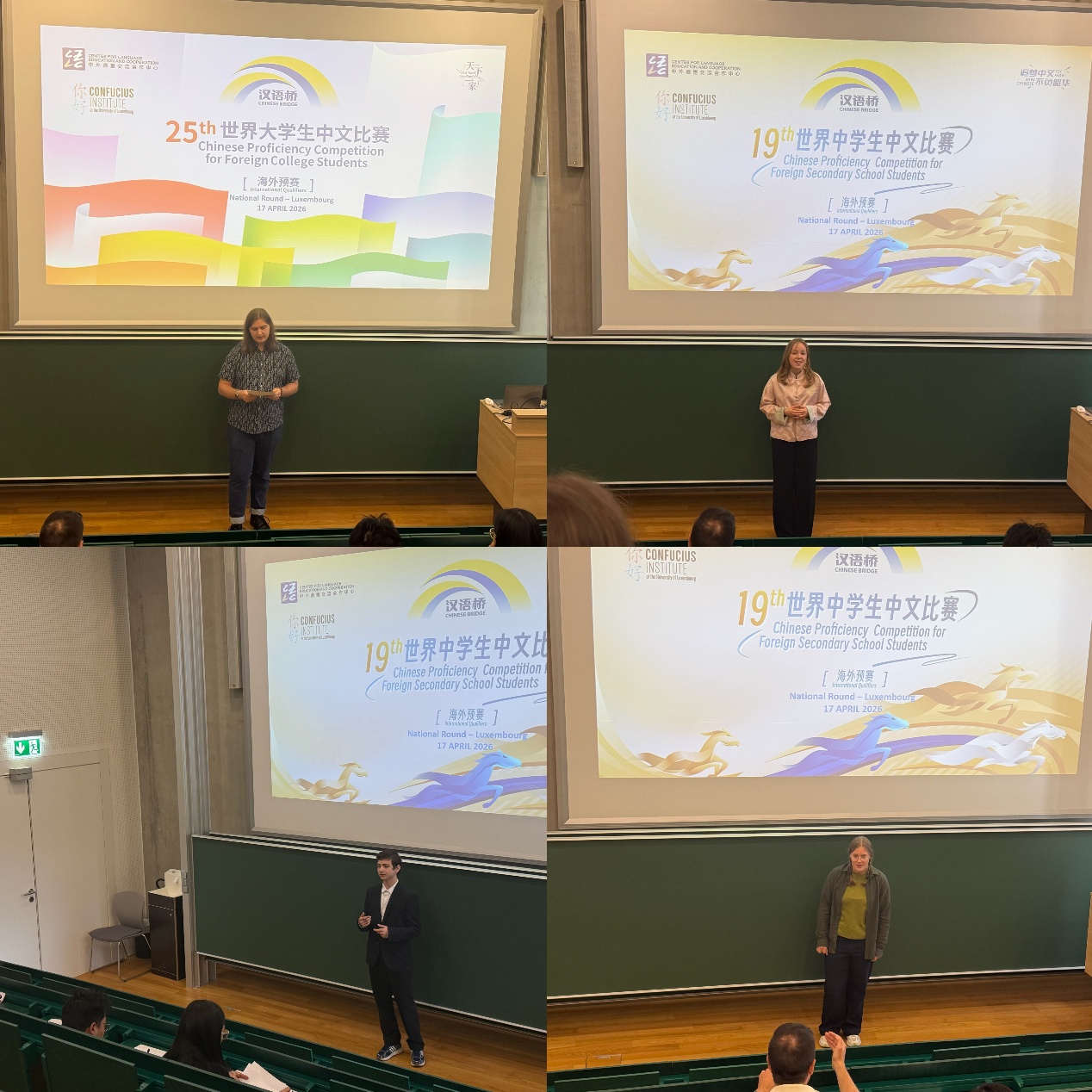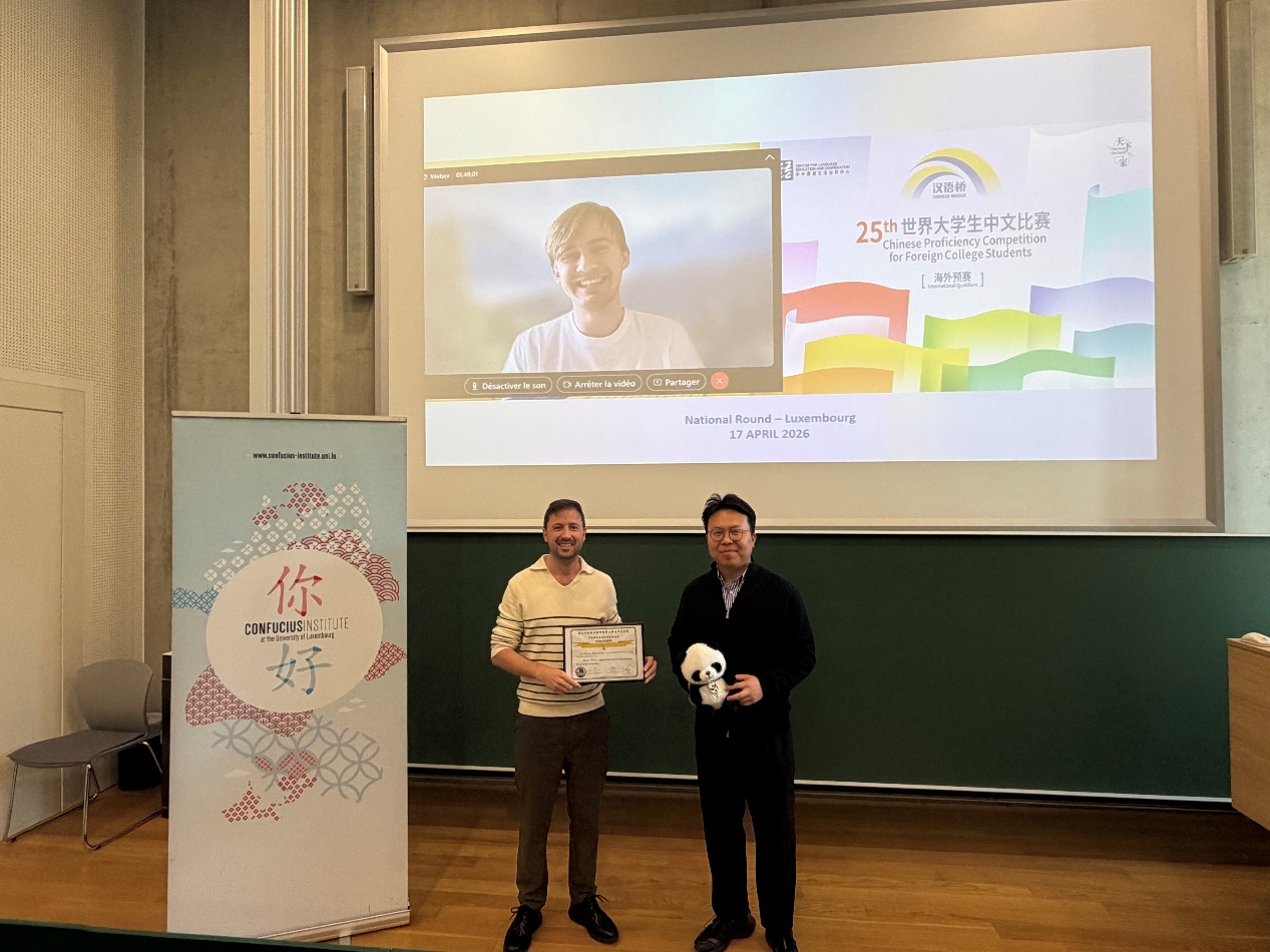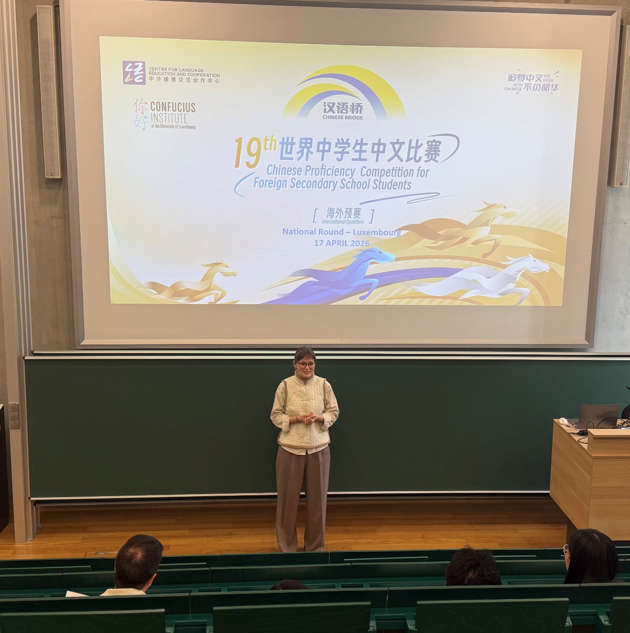 2026年4月18日,由卢森堡大学孔子学院主办的第25届“汉语桥”世界大学生中文比赛暨第19届“汉语桥”世界中学生中文比赛卢森堡赛区预选赛在卢森堡大学Belval校区成功举办。来自卢森堡大学法律系的STERNON Warren(司徒万恒)同学获得大学生组第一名;中学生组桂冠则由雅典娜中学(Lycée Athénée)的BAILLEUL Paula同学摘得。