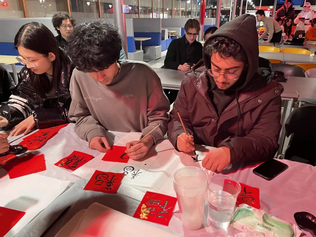 Adding to the immersive cultural experience, two hands-on activity stations—traditional calligraphy and papercutting—were led by NCI teachers and volunteers. These stations were packed throughout the evening as students eagerly practiced writing the auspicious "福" (Fu, meaning "blessing") character on red couplet papers and carefully crafted intricate zodiac-themed cuttings to take home as lucky keepsakes.